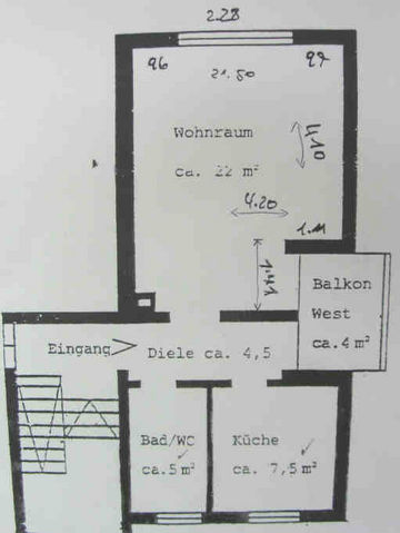 Bitte senden Sie uns Ihre Anfrage per Email mit kurzen Angaben zu Ihrer Person, Berufs- und Einkommenssituation. Diese gemütliche Single-Wohnung liegt im 1. OG. eines 8 Parteienhauses: + Wohnküche mit Einbauküche 7,5 m² + helles Zimmer 22 m² + Tageslicht-Badezimmer mit Wanne und Waschmaschine + sonnige Loggia in Westausrichtung + im Wohnbereich liegt Parkettboden + Fliesen in Küche und Bad + Rollläden + Telefon ist DSL-fähig + Kellerabteil + Trockenraum